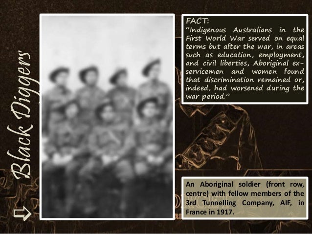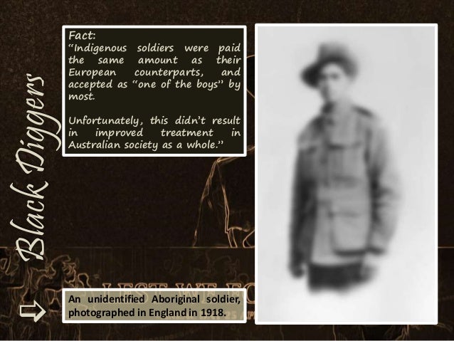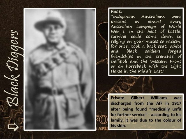 - 24. BlackDiggers Private Gilbert Williams was discharged from the AIF in 1917 after being found “medically unfit for further service” - according to his family, it was due to the colour of his skin. Fact: “Indigenous Australians were present in almost every Australian campaign of World War I. In the heat of battle, survival could come down to relying on your mates so racism, for once, took a back seat. White and black soldiers forged friendships in the trenches of Gallipoli and the Western Front or on horseback with the Light Horse in the Middle East.”