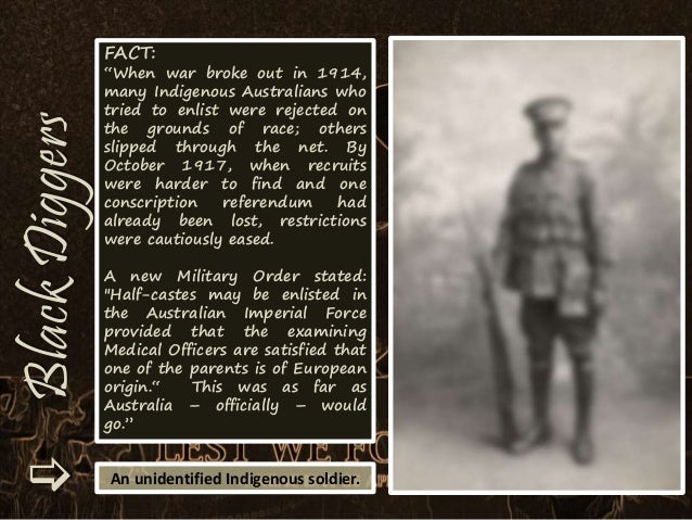 - 12. BlackDiggers An unidentified Indigenous soldier. FACT: “When war broke out in 1914, many Indigenous Australians who tried to enlist were rejected on the grounds of race; others slipped through the net. By October 1917, when recruits were harder to find and one conscription referendum had already been lost, restrictions were cautiously eased. A new Military Order stated: "Half-castes may be enlisted in the Australian Imperial Force provided that the examining Medical Officers are satisfied that one of the parents is of European origin.“ This was as far as Australia – officially – would go.”