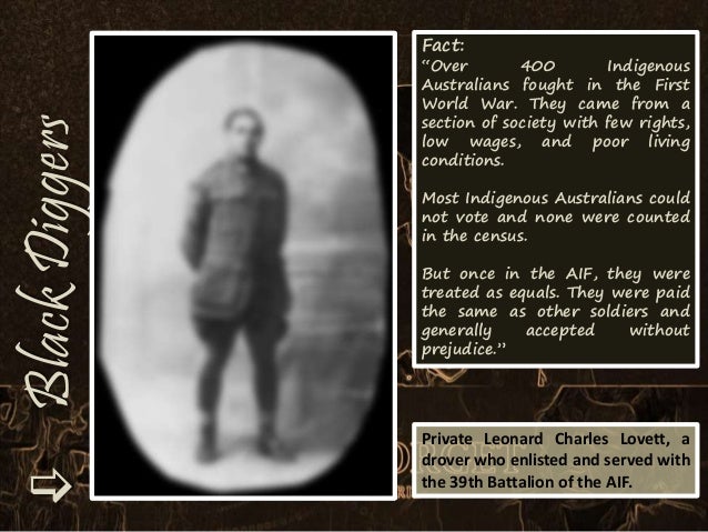 - 13. BlackDiggers Private Leonard Charles Lovett, a drover who enlisted and served with the 39th Battalion of the AIF. Fact: “Over 400 Indigenous Australians fought in the First World War. They came from a section of society with few rights, low wages, and poor living conditions. Most Indigenous Australians could not vote and none were counted in the census. But once in the AIF, they were treated as equals. They were paid the same as other soldiers and generally accepted without prejudice.”
