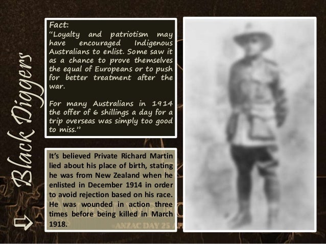 - 14. BlackDiggers It’s believed Private Richard Martin lied about his place of birth, stating he was from New Zealand when he enlisted in December 1914 in order to avoid rejection based on his race. He was wounded in action three times before being killed in March 1918. Fact: “Loyalty and patriotism may have encouraged Indigenous Australians to enlist. Some saw it as a chance to prove themselves the equal of Europeans or to push for better treatment after the war. For many Australians in 1914 the offer of 6 shillings a day for a trip overseas was simply too good to miss.”