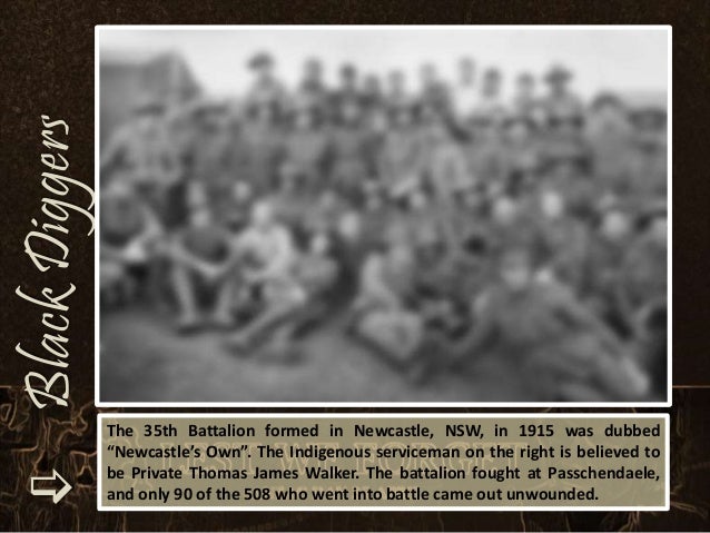 - 16. BlackDiggers The 35th Battalion formed in Newcastle, NSW, in 1915 was dubbed “Newcastle’s Own”. The Indigenous serviceman on the right is believed to be Private Thomas James Walker. The battalion fought at Passchendaele, and only 90 of the 508 who went into battle came out unwounded.