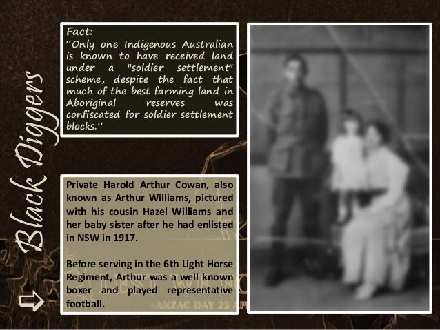 - 17. BlackDiggers Private Harold Arthur Cowan, also known as Arthur Williams, pictured with his cousin Hazel Williams and her baby sister after he had enlisted in NSW in 1917. Before serving in the 6th Light Horse Regiment, Arthur was a well known boxer and played representative football. Fact: “Only one Indigenous Australian is known to have received land under a "soldier settlement" scheme, despite the fact that much of the best farming land in Aboriginal reserves was confiscated for soldier settlement blocks.”