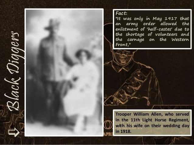 - 18. BlackDiggers Trooper William Allen, who served in the 11th Light Horse Regiment, with his wife on their wedding day in 1918. Fact: "It was only in May 1917 that an army order allowed the enlistment of 'half-castes' due to the shortage of volunteers and the carnage on the Western Front,"