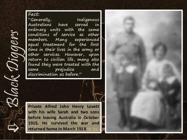 - 19. BlackDiggers Private Alfred John Henry Lovett with his wife Sarah and two sons before leaving Australia in October 1915. He survived the war and returned home in March 1918. Fact: “Generally, Indigenous Australians have served in ordinary units with the same conditions of service as other members. Many experienced equal treatment for the first time in their lives in the army or other services. However, upon return to civilian life, many also found they were treated with the same prejudice and discrimination as before.”