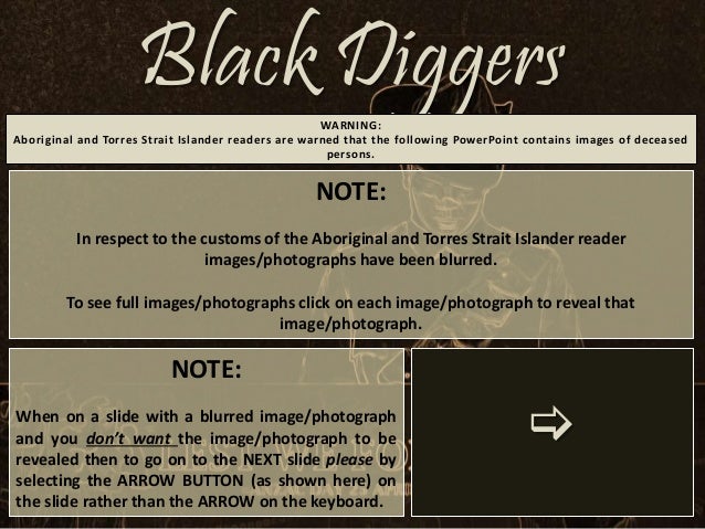 - 2. Black Diggers NOTE: In respect to the customs of the Aboriginal and Torres Strait Islander reader images/photographs have been blurred. To see full images/photographs click on each image/photograph to reveal that image/photograph. WARNING: Aboriginal and Torres Strait Islander readers are warned that the following PowerPoint contains images of deceased persons. NOTE: When on a slide with a blurred image/photograph and you don’t want the image/photograph to be revealed then to go on to the NEXT slide please by selecting the ARROW BUTTON (as shown here) on the slide rather than the ARROW on the keyboard.