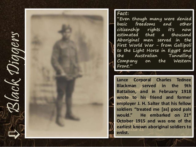 - 20. BlackDiggers Lance Corporal Charles Tednee Blackman served in the 9th Battalion, and in February 1918 wrote to his friend and former employer J. H. Salter that his fellow soldiers “treated me [as] good pals would.” He embarked on 21st October 1915 and was one of the earliest known aboriginal soldiers to enlist. Fact: “Even though many were denied basic freedoms and other citizenship rights it's now estimated that a thousand Aboriginal men served in the First World War - from Gallipoli to the Light Horse in Egypt and the Australian Tunnelling Company on the Western Front.”