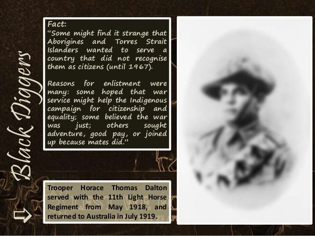 - 21. BlackDiggers Trooper Horace Thomas Dalton served with the 11th Light Horse Regiment from May 1918, and returned to Australia in July 1919. Fact: “Some might find it strange that Aborigines and Torres Strait Islanders wanted to serve a country that did not recognise them as citizens (until 1967). Reasons for enlistment were many: some hoped that war service might help the Indigenous campaign for citizenship and equality; some believed the war was just; others sought adventure, good pay, or joined up because mates did.”