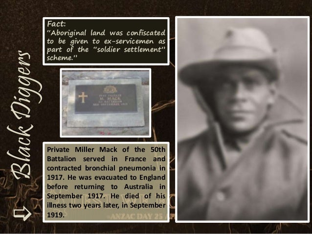- 25. BlackDiggers Private Miller Mack of the 50th Battalion served in France and contracted bronchial pneumonia in 1917. He was evacuated to England before returning to Australia in September 1917. He died of his illness two years later, in September 1919. Fact: “Aboriginal land was confiscated to be given to ex-servicemen as part of the “soldier settlement” scheme.”