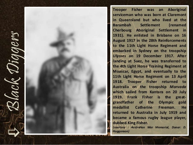 - 26. BlackDiggers Trooper Fisher was an Aboriginal serviceman who was born at Claremont in Queensland but who lived at the Barambah Settlement (renamed Cherbourg Aboriginal Settlement in 1931). He enlisted in Brisbane on 16 August 1917 in the 28th Reinforcements to the 11th Light Horse Regiment and embarked in Sydney on the troopship Ulysses on 19 December 1917. After landing at Suez, he was transferred to the 4th Light Horse Training Regiment at Moascar, Egypt, and eventually to the 11th Light Horse Regiment on 13 April 1918. Trooper Fisher returned to Australia on the troopship Morvada which sailed from Kantara on 20 July 1919. Frank Fisher is the great- grandfather of the Olympic gold medallist Catherine Freeman. He returned to Australia in July 1919 and became a famous rugby league player, dubbed King Fisher. (courtesy : Australian War Memorial, Donor: D. Huggonson)
