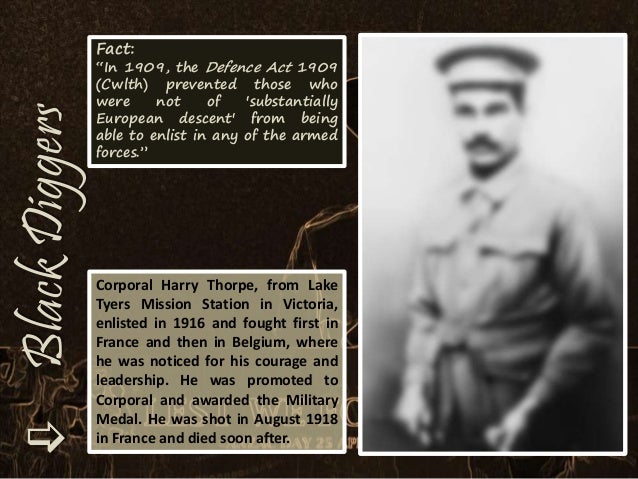 - 27. BlackDiggers Corporal Harry Thorpe, from Lake Tyers Mission Station in Victoria, enlisted in 1916 and fought first in France and then in Belgium, where he was noticed for his courage and leadership. He was promoted to Corporal and awarded the Military Medal. He was shot in August 1918 in France and died soon after. Fact: “In 1909, the Defence Act 1909 (Cwlth) prevented those who were not of 'substantially European descent' from being able to enlist in any of the armed forces.”