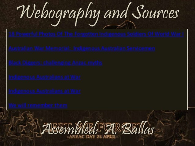 - 28. 18 Powerful Photos Of The Forgotten Indigenous Soldiers Of World War I Australian War Memorial: Indigenous Australian Servicemen Black Diggers: challenging Anzac myths Indigenous Australians at War Indigenous Australians at War We will remember them Webography and Sources Assembled: A. Ballas