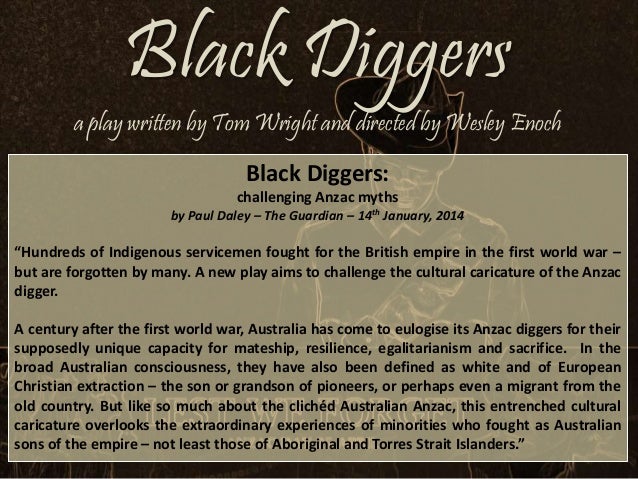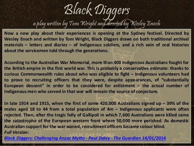 - 5. Black Diggers a play written by Tom Wright and directed by Wesley Enoch Now a new play about their experiences is opening at the Sydney festival. Directed by Wesley Enoch and written by Tom Wright, Black Diggers draws on both traditional archival materials – letters and diaries – of Indigenous soldiers, and a rich vein of oral histories about the servicemen told through the generations. According to the Australian War Memorial, more than 400 Indigenous Australians fought for the British empire in the first world war. This is probably a conservative estimate: thanks to curious Commonwealth rules about who was eligible to fight – Indigenous volunteers had to prove to recruiting officers that they were, despite appearances, of “substantially European descent” in order to be considered for enlistment – the actual number of Indigenous men who served in that war will remain the source of conjecture. In late 1914 and 1915, when the first of some 420,000 Australians signed up – 39% of the males aged 18 to 44 from a total population of 4m – Indigenous applicants were often rejected. Then, after the tragic folly of Gallipoli in which 7,600 Australians were killed came the catastrophe of the European western front where 50,000 more perished. As domestic Australian support for the war waned, recruitment officers became colour blind. Full Version: Black Diggers: Challenging Anzac Myths - Paul Daley - The Guardian 14/01/2014