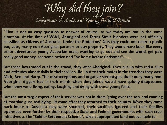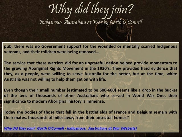 - 7. Why did they join? Indigenous: Australians at War by Garth O’Connell pub, there was no Government support for the wounded or mentally scarred Indigenous veterans, and their children were being removed... The service that these warriors did for an ungrateful nation helped provide momentum to the growing Aboriginal Rights Movement in the 1930's. They provided hard evidence that they, as a people, were willing to serve Australia for the better, but at the time, white Australia was not willing to help them get on with life. Even though their small number (estimated to be 500-600) seems like a drop in the bucket of the tens of thousands of other Australians who served in World War One, their significance to modern Aboriginal history is immense. Today the bodies of those that fell in the battlefields of France and Belgium remain with their mates, thousands of miles away from their ancestral homes.” Why did they join? Garth O'Connell - Indigenous: Australians at War (Website)