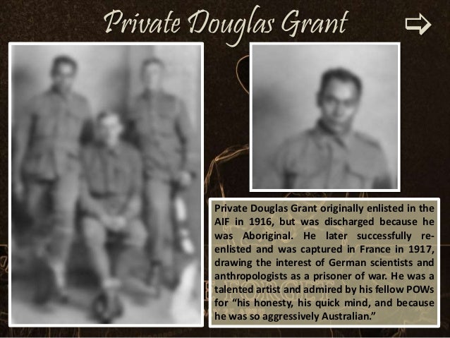 - 8. Private Douglas Grant Private Douglas Grant originally enlisted in the AIF in 1916, but was discharged because he was Aboriginal. He later successfully re- enlisted and was captured in France in 1917, drawing the interest of German scientists and anthropologists as a prisoner of war. He was a talented artist and admired by his fellow POWs for “his honesty, his quick mind, and because he was so aggressively Australian.”